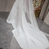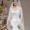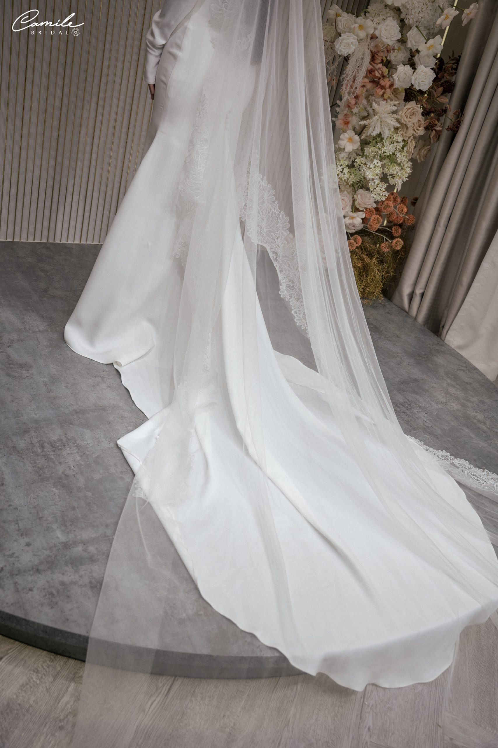 The lace veil was meticulously handcrafted, featuring floral motifs along the edges to add softness and romance to the overall look. Paired with the minimalist mermaid silhouette, the lace veil creates a perfect balance between simplicity and femininity.
