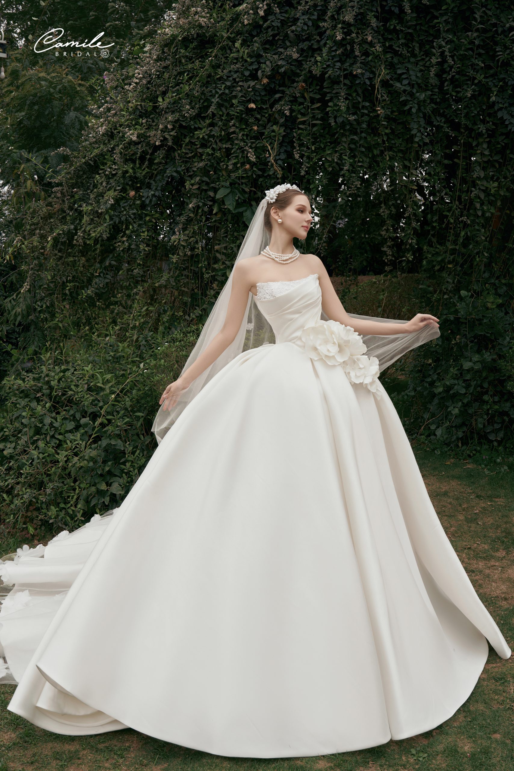 Điểm nhấn nổi bật của váy cưới Look 02 chính là các bông hoa 3D lớn được dựng thủ công hoàn toàn bởi nghệ nhân Camile. Những bông hoa này được đính dọc phần hông váy, vừa mềm mại, vừa tạo chiều sâu cho thiết kế, khiến chiếc váy trở nên sống động như một khu vườn đang nở rộ.