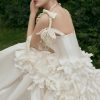 Phần tà váy được xếp lớp tinh tế, mềm mại giúp tăng độ rủ và tạo cảm giác “bay” theo từng bước đi. Khi cô dâu di chuyển, chiếc váy tạo nên những đường cong nhẹ nhàng, duyên dáng mà không nặng nề – lý tưởng cho tiệc cưới ngoài trời, sân vườn, hay không gian tối giản hiện đại.