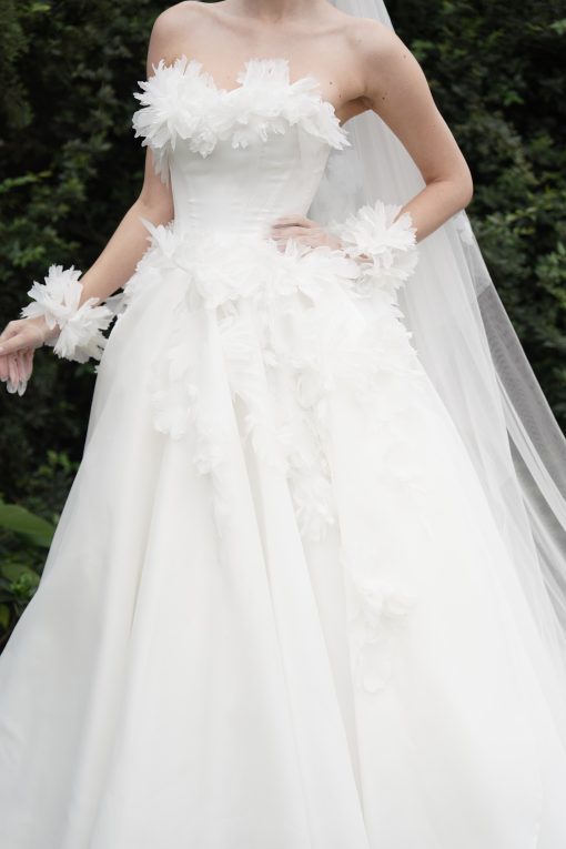 Hoa 3D được dựng thủ công trên nền organza là điểm nhấn nổi bật của thiết kế. Từng cánh hoa được làm nổi khối và sắp đặt khéo léo để tạo cảm giác như những cánh hoa đang nở rộ theo từng chuyển động của cô dâu. Đây không chỉ là trang trí – mà là một tác phẩm nghệ thuật sống động trên váy cưới.