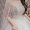 Thiết kế váy cưới của Hương Quỳnh mang dáng ballgown kinh điển, phần cúp ngực kết hợp corset ôm dáng giúp tôn lên vẻ trẻ trung và mềm mại. Từng chi tiết đá pha lê được đính thủ công tỉ mỉ, tạo nên hiệu ứng lấp lánh, giúp nàng toả sáng rạng rỡ trong từng khoảnh khắc.